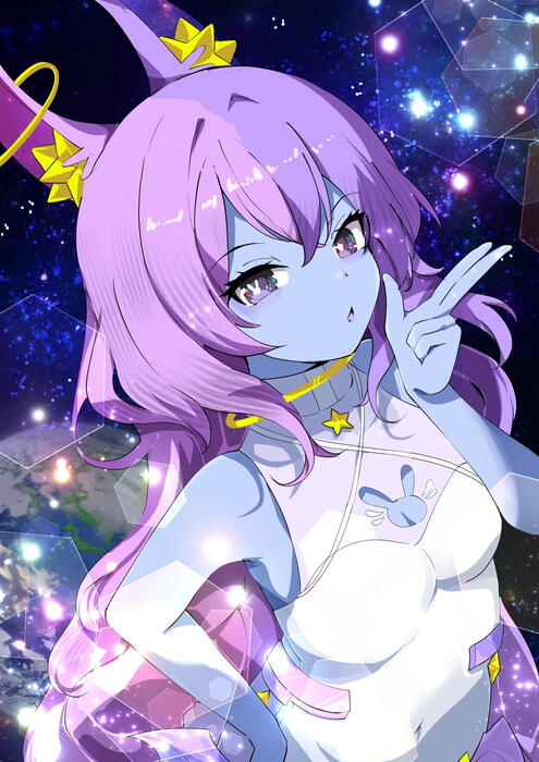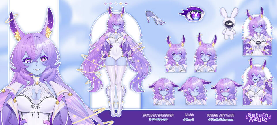 Saturn was born on a planet full of sheltered space bunnies, as the only blue bunny. Her community ostracized her, thus providing no answers to why she's blue. In her adult years, Saturn decided to sneak onto a trader's spaceship. She then landed on a foreign planet, with only pocket change from her home planet. To start her adventure, Saturn knew she needed money. Her plan with this money was to earn enough to buy a better ship. She needed to explore to farther planets to continue her research on genetic mutation.Saturn heard rumors about a way to earn money fast. Unfortunately, it was a Casino owned by Jupiter. She got consumed by the addicting fun, and went into debt. Now her boss is Jupiter, he is forcing her to earn 100,000 Astro-coins. Saturn has now turned to streaming. Not only to collect Astro-coins to pay off this debt, but to be able to continue her research!
