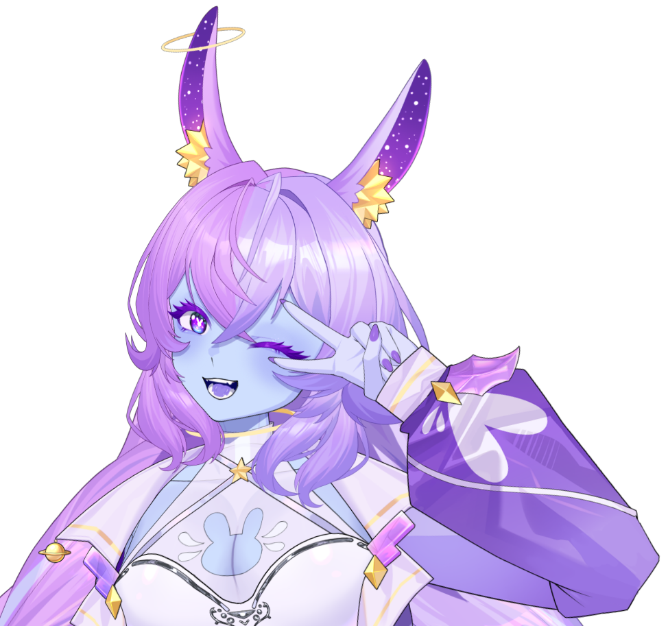 Saturn was born on a planet full of sheltered space bunnies, as the only blue bunny. Her community ostracized her, thus providing no answers to why she's blue. In her adult years, Saturn decided to sneak onto a trader's spaceship. She then landed on a foreign planet, with only pocket change from her home planet. To start her adventure, Saturn knew she needed money. Her plan with this money was to earn enough to buy a better ship. She needed to explore to farther planets to continue her research on genetic mutation.Saturn heard rumors about a way to earn money fast. Unfortunately, it was a Casino owned by Jupiter. She got consumed by the addicting fun, and went into debt. Now her boss is Jupiter, he is forcing her to earn 100,000 Astro-coins. Saturn has now turned to streaming. Not only to collect Astro-coins to pay off this debt, but to be able to continue her research!
